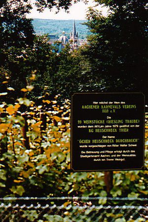 Im Jahr 1979 stiftete die Karnevalsgesellschaft „Trierer Heuschreck“ 121 Rebstöcke der Sorte Riesling. Da ab 100 Weinstöcken der Weinanbau als gewerblich betrieben gilt, verbunden mit Anmeldungs-, Genehmigungs- und Abgabepflichten, entschloss sich der Aachener Karnevalsverein, auf der von der Stadt Aachen zur Verfügung gestellten Fläche 99 Rebstöcke anzupflanzen.